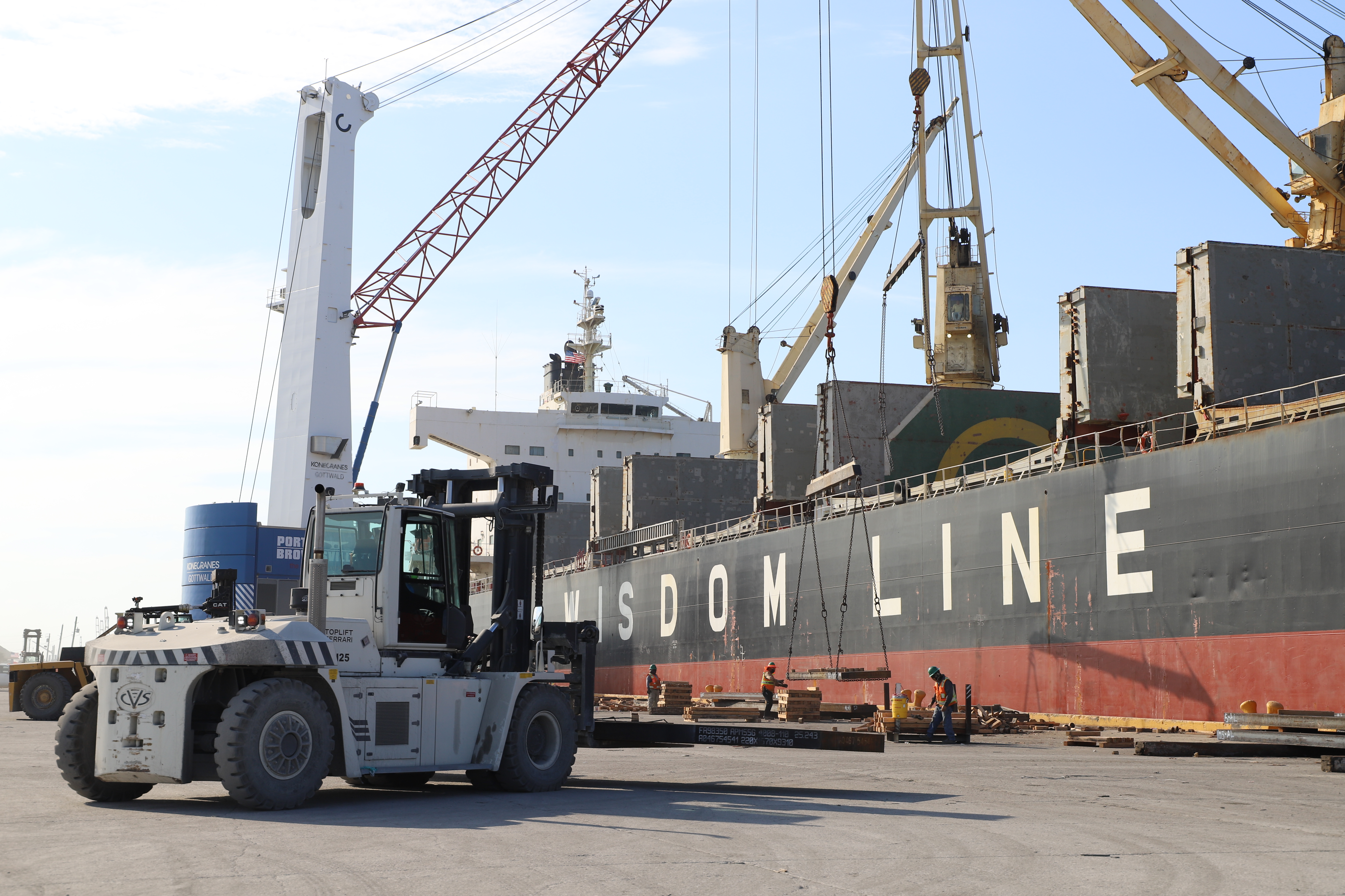 A crane operator from the Port of Brownsville and longshoremen from Gulf Stream Marine work in tandem to discharge steel slab from a vessel at Dock 16.